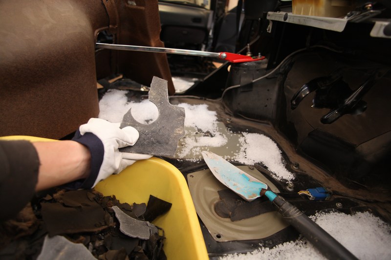 Postup: Odstrojite interier (na kompletne ocistenie karoserie je nutne vybrat cely koberec tzn. povolit palubovku), vysypete lad na gumoasfalt a cakate kym zacne pukat/praskat a ked dopraska, presuniete ho na ine miesto, ked mate 10kg na cele auto. Vydrzi pomerne dlho, samozrejme je dobre pracovat na cim studensom mieste, idealne v zime, ked je -25 to by stacilo snad aj 5kg na cele auto. Potom trieskate gumenym kladivom po miestach ktore sa uplne neodlepili, vyhodite gumoasfalt a hotovo. Kedze sa neposkarabal zakladny nater, nieje potrebne osetrovat plechy. Pripravte sa vsak na vyvaranie, kedze pod gumasfaltom urcite objavite hrdzu.