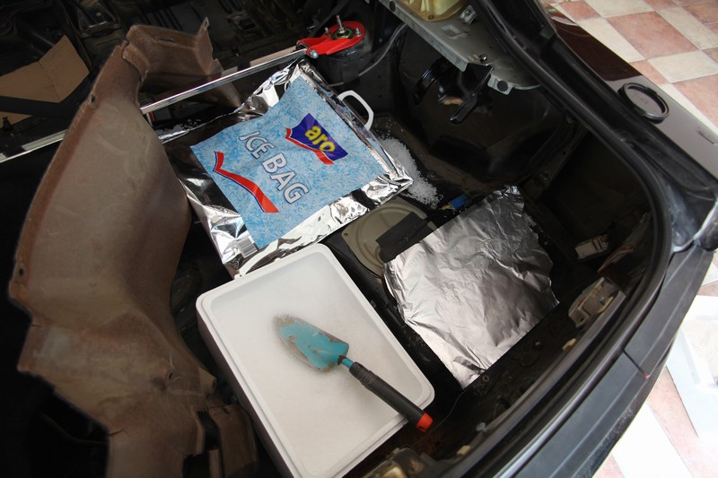 Nástroje/pomocky, ktoré potrebujete: Gumene kladivo, rukavice, ktore velmi dobre izoluju, polystyrenove boxy na prepravu suchého ľadu (maju ich v metre na oddeleni ryb a plodov mora, 5kg box stoji 1euro) alebo tasku na lad/ice bag(maju ju napr.v bille, metre), ak nemate boxy, ktore su vhodnejsie, ja som pouzil aj alobal a ice bag na zakrytie ladu po aplikacii, aby mi dlhsie vydrzal, lopatku na neberanie ladu a metlicku na premiestnovanie ladu po karoserii.
