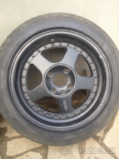 Šířky 7,5J ET20 a 9J ET 25. Stříknuté do černého plastidipu, 2x pneu KO, 2x zimní pneu OK, + pokličky.