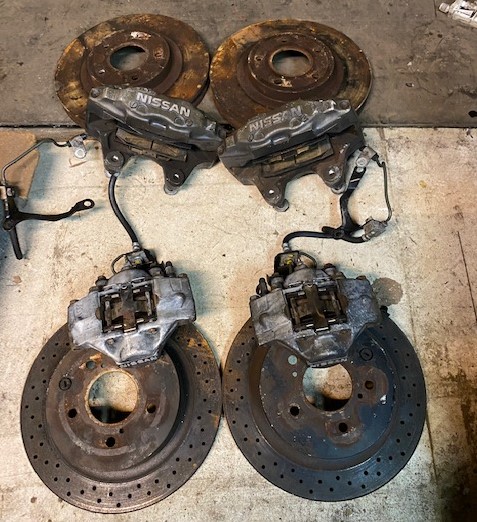 Přední brzdy včetně destiček a kotoučů, zadní včetně destiček a kotouče můžu dodat o něco později až je nechám oměřit kvůli výrobě nových a větších.