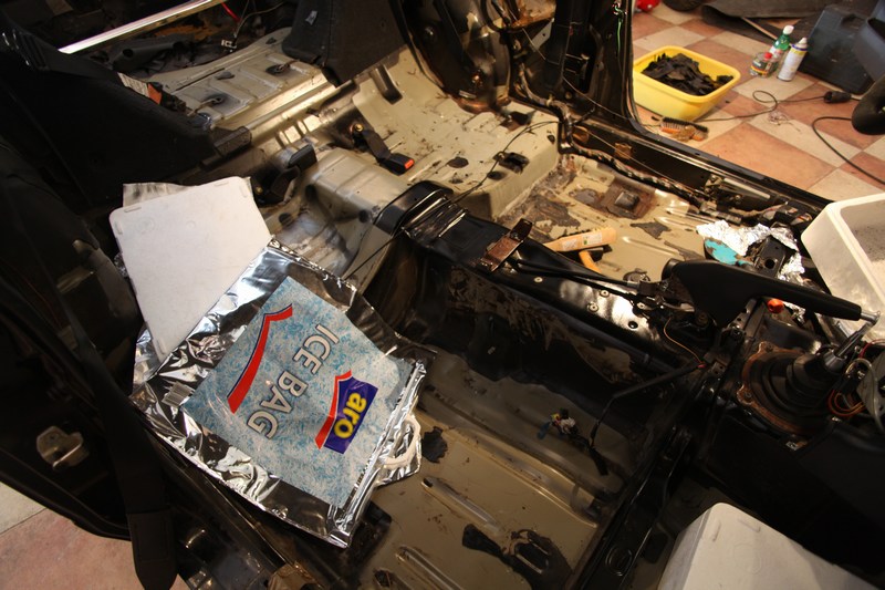 Postup: Odstrojite interier (na kompletne ocistenie karoserie je nutne vybrat cely koberec tzn. povolit palubovku), vysypete lad na gumoasfalt a cakate kym zacne pukat/praskat a ked dopraska, presuniete ho na ine miesto, ked mate 10kg na cele auto. Vydrzi pomerne dlho, samozrejme je dobre pracovat na cim studensom mieste, idealne v zime, ked je -25 to by stacilo snad aj 5kg na cele auto. Potom trieskate gumenym kladivom po miestach ktore sa uplne neodlepili, vyhodite gumoasfalt a hotovo. Kedze sa neposkarabal zakladny nater, nieje potrebne osetrovat plechy. Pripravte sa vsak na vyvaranie, kedze pod gumasfaltom urcite objavite hrdzu.