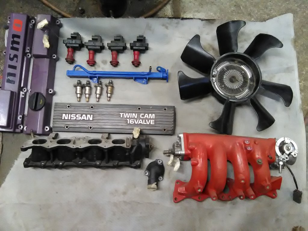 Prodám věci na Nissan 200sx S13 CA18DET 4x vstřik, 4x cívky, vrtule, motor bez hlavy, dekly ventylů a kryt cívek, palivová rampa, komplet sání Cena dohodou